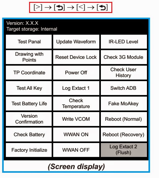 * Confirmer le menu HOME a été complètement affichée, et appuyez sur la touche dans l’ordre suivant.Après un certain temps, le menu du mode de test s’affiche, et l’appareil passe en mode de test.